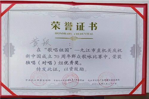 在全市30余家單位精選的選手中,黃穎以優(yōu)秀成績榮獲了九江市市直機關慶祝新中國成立70周年群眾歌詠比賽獨唱(對唱)組優(yōu)秀獎。她用嘹亮的歌聲抒發(fā)了對黨、祖國的熱愛之情,表達了對新中國成立70周年的殷切盼望和美好祝福,祝福祖國未來更美好!