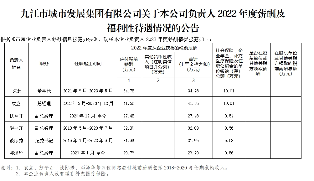 九江市城市發(fā)展集團(tuán)有限公司關(guān)于本公司負(fù)責(zé)人2022年度薪酬及福利性待遇情況的公告