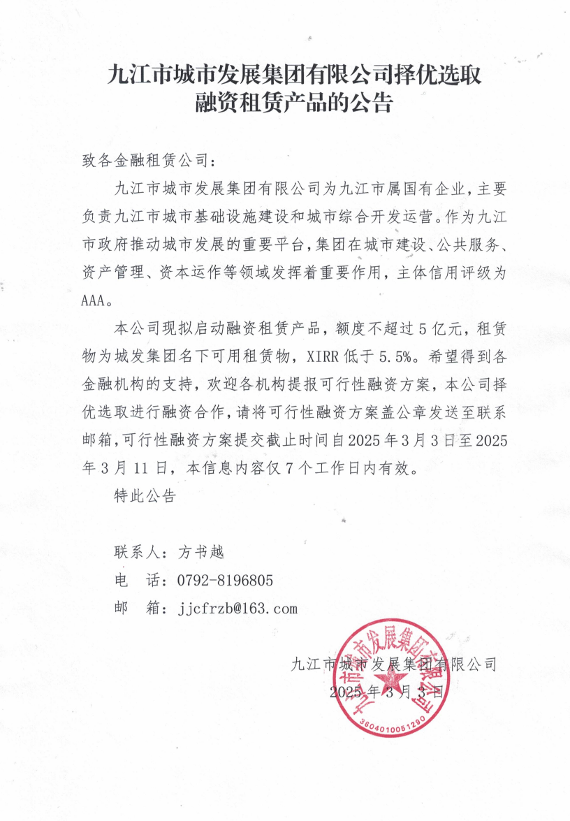 九江市城市發(fā)展集團(tuán)有限公司擇優(yōu)選取融資租賃產(chǎn)品的公告